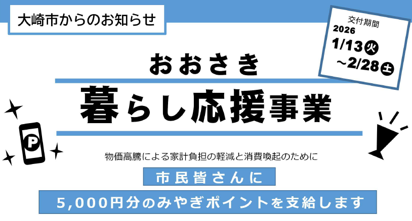 大崎市では、物価高騰による家計の負担を軽減し、地域での消費を喚起するために、県のデジタルポイント「みやぎポイント」を活用した**「おおさき暮らし応援事業」**を実施します。