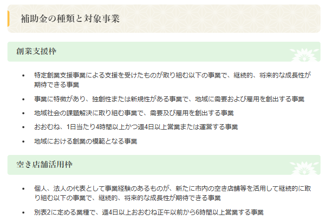 ➡これは昨年まで創業者向けの補助金として存在していた「おおさきチャレンジ創業応援事業費補助金」と「大崎市商店街空き店舗活用事業補助金」が一体となったイメージの新たな補助金となります。